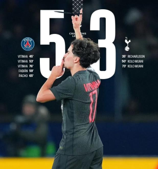 Il Tottenham, in trasferta, ha lanciato il primo attacco. Al 35° minuto, Richarlison ha segnato di testa, portando il Tottenham in vantaggio per 1-0. Al 45° minuto, Vitinha Ferreira ha segnato con un tiro potente, portando il punteggio sull'1-1. Al 50° minuto, Randal Kolo Muani ha segnato di nuovo per gli ospiti, portando il punteggio sul 2-1 per il Tottenham. Al 53° minuto, Vitinha Ferreira ha insaccato un tiro a giro, pareggiando il punteggio sul 2-2. Al 59° minuto, Fabián Ruiz ha segnato facilmente, portando il PSG in vantaggio per 3-2! Al 65° minuto, Willian Pacho ha sfruttato un'opportunità in area di rigore, calciando in rete e portando il PSG sul 4-2! Al 73° minuto, Randal Kolo Muani ha segnato il suo secondo gol, portando il Tottenham sul 3-4. Al 76° minuto, Vitinha Ferreira, con la maglia Paris Saint-Germain del, ha trasformato un rigore completando la sua tripletta! Il PSG si è assicurato una vittoria per 5-3.